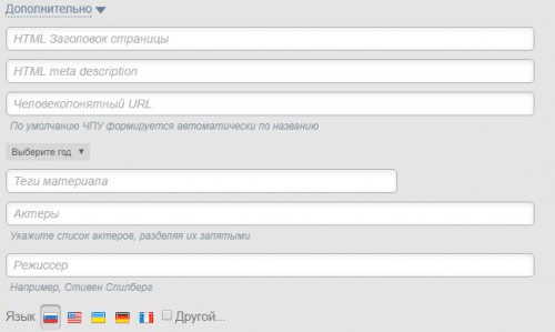 - Название материала. По умолчанию является текстом ссылки на добавляемое видео в каталоге и помещается в переменную $TITLE$. Является обязательным для заполнения полем.