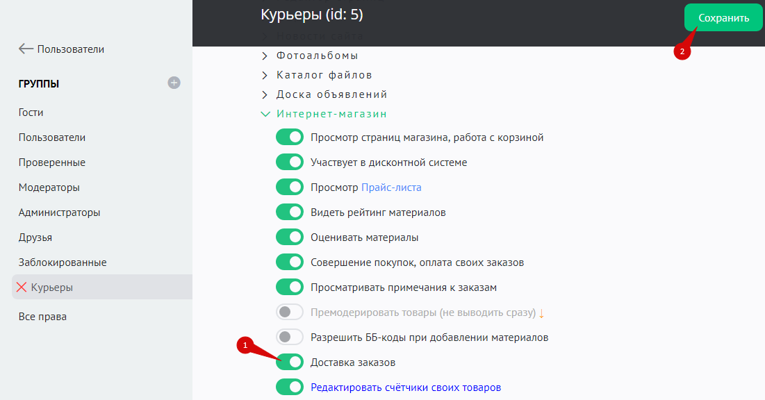 Настройка работы курьеров начинается с создания группы пользователей с возможностью доставлять заказы. Создайте новую группу пользователей (как создавать группы пользователей). При создании включите право “Интернет-магазин” / “Доставка заказов” (как изменять права группы пользователей).