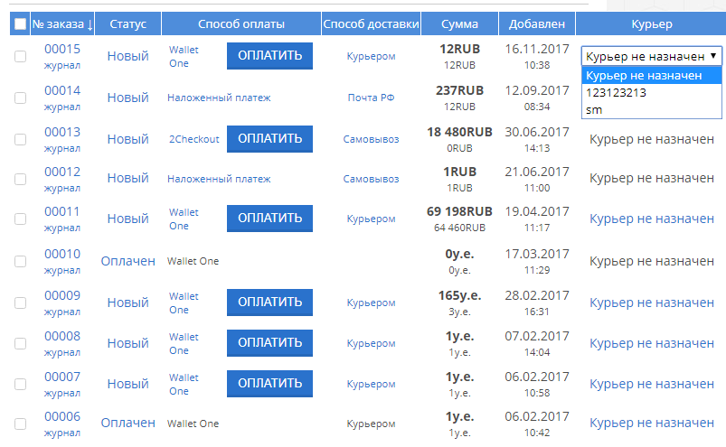 Чтобы назначить курьера, необходимо перейти на страницу управления заказами http://ваш_сайт/shop/invoices. Назначать курьера к заказу может пользователь с правом “Управлять заказами”. У заказов с подходящим способом доставки в колонке “Курьер” будет отображена ссылка: