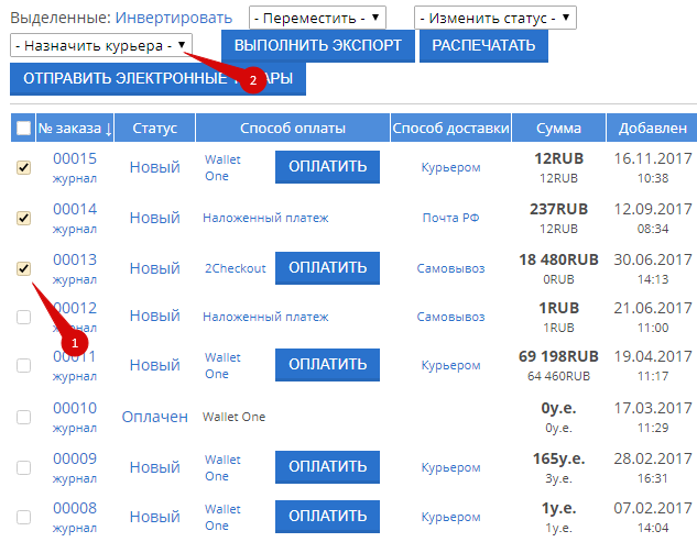 Если нужно назначить курьера на несколько заказов сразу, выделите заказы в таблице и найдите выпадающий список "Назначить курьера":