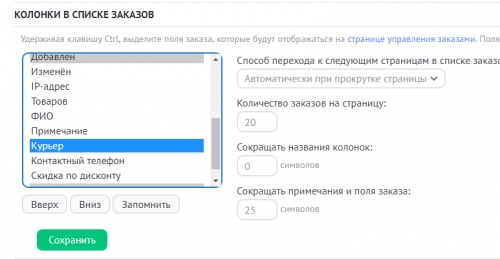 Сначала в таблицу заказов добавьте колонку “Курьер”: “Управление полями заказа” / “Колонки в списке заказов” / “Курьер”: