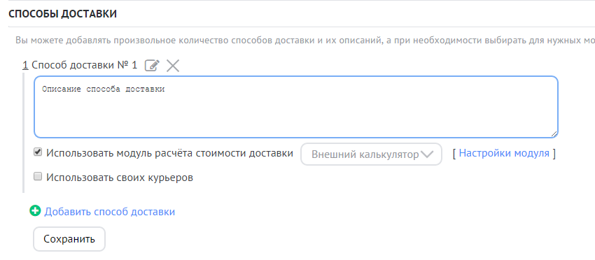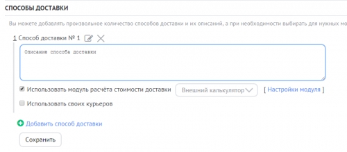 Чтобы начать пользоваться модулем, включите опцию “Использовать модуль расчёта стоимости доставки” и выберите в ней значение “Внешний калькулятор”. После этого нажмите на кнопку “Сохранить”.