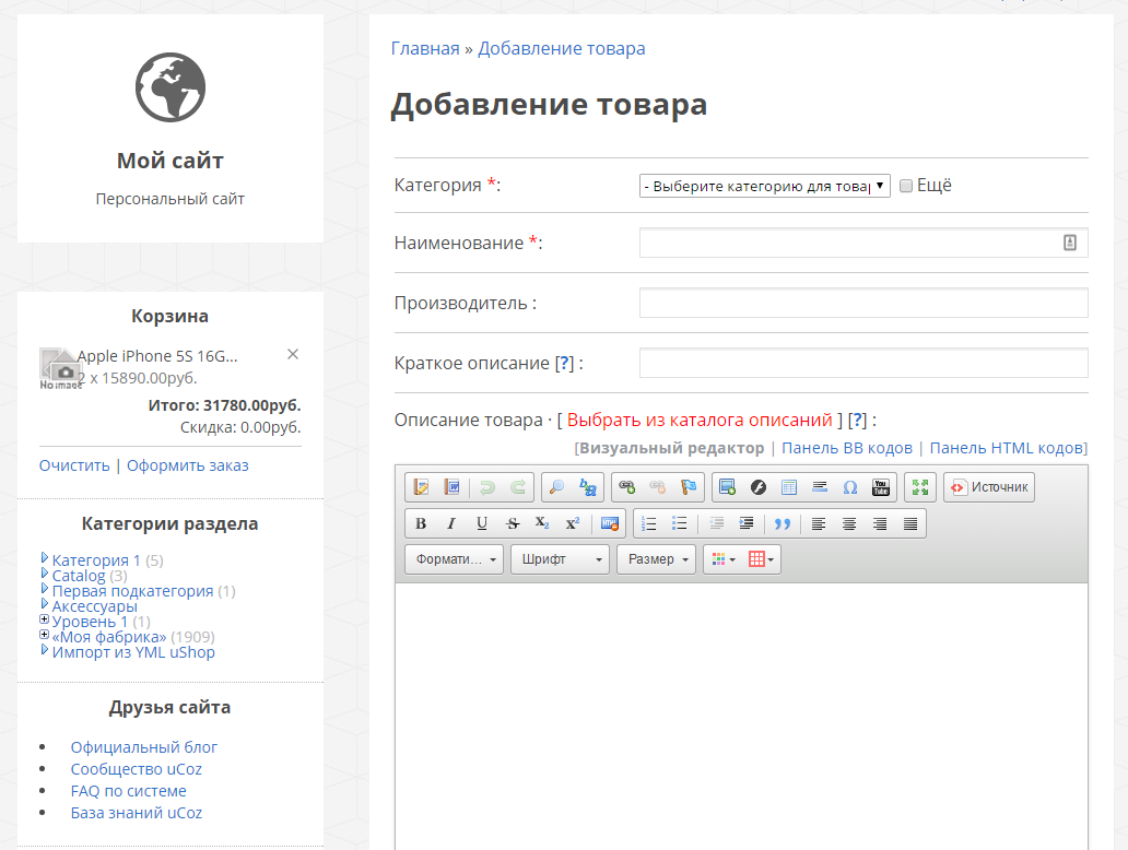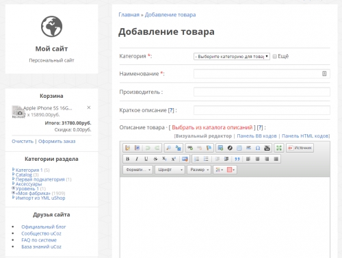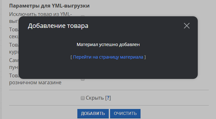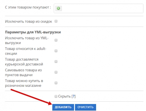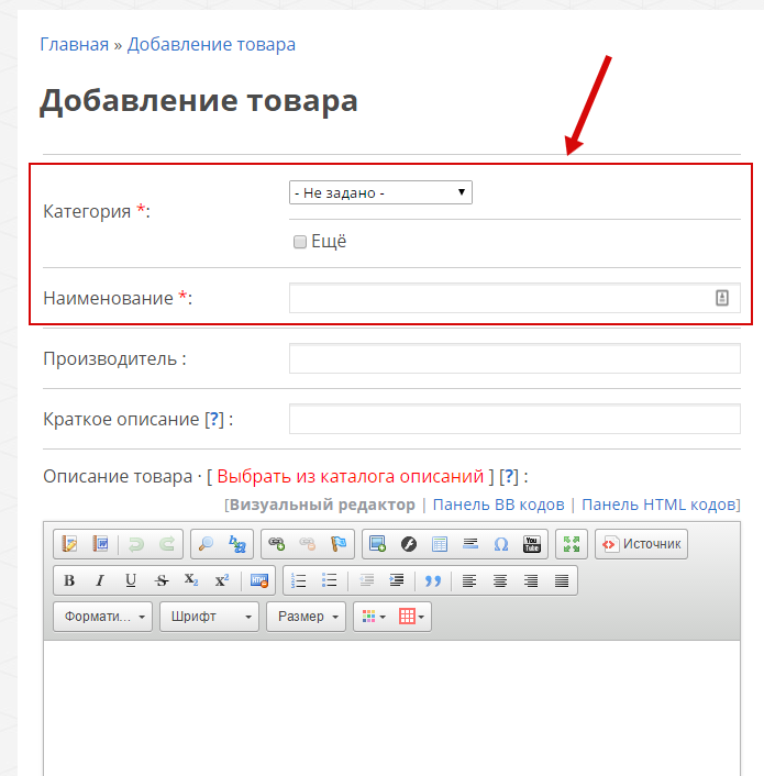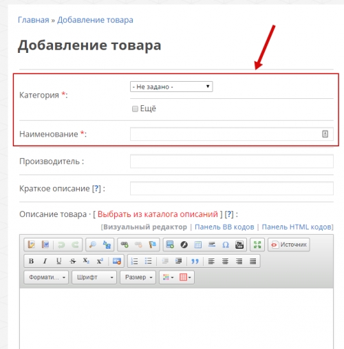 Важно! Если вы планируете добавление на сайт большого количества товаров, воспользуйтесь инструментами массового добавления товаров: экспорт из XLS, YML, 1C.