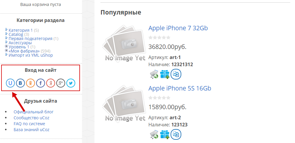 После создания сайта для вашего uID-аккаунта в интернет-магазине автоматически создается учетная запись администратора. Перейдите в интернет-магазин и найдите форму входа или кнопку с надписью “Вход”. Они могут выглядеть следующим образом: