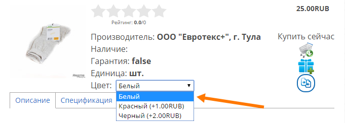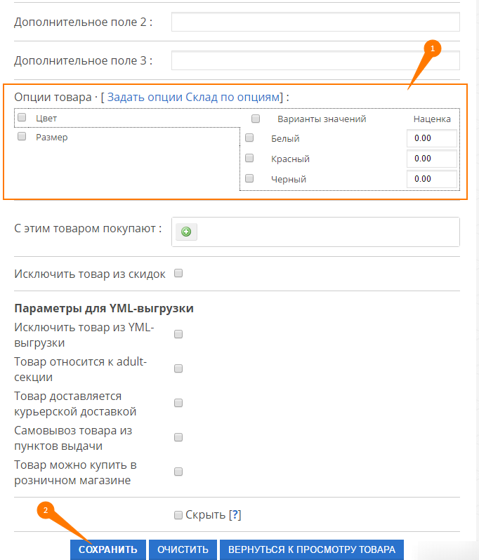 В блоке опций (1) установите модификации товара и наценку для них. Сохраните изменения (2). Варианты товара появятся на сайте. Тип опции select (по умолчанию):