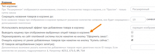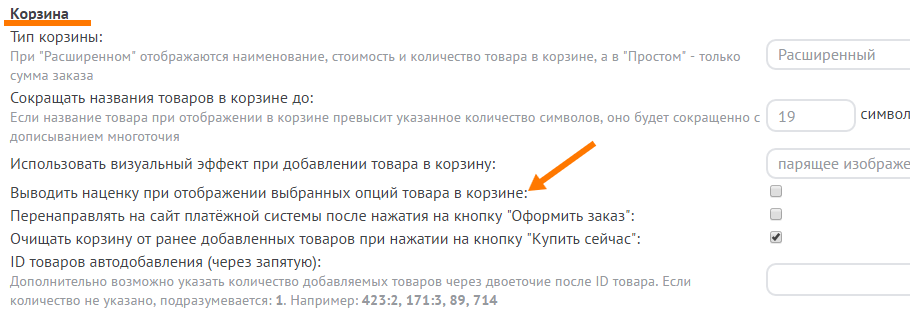 Настройка Корзина / Выводить наценку при отображении выбранных опций товара в корзине поможет пользователям видеть величину наценки опции в корзине: