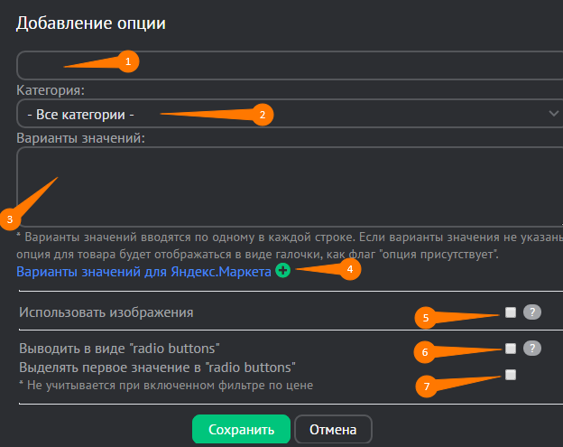 - Варианты значений. Например для цвета: красный, синий, зеленый. Каждое значение с новой строки. Если оставить поле пустым, то опция будет представлена как checkbox.