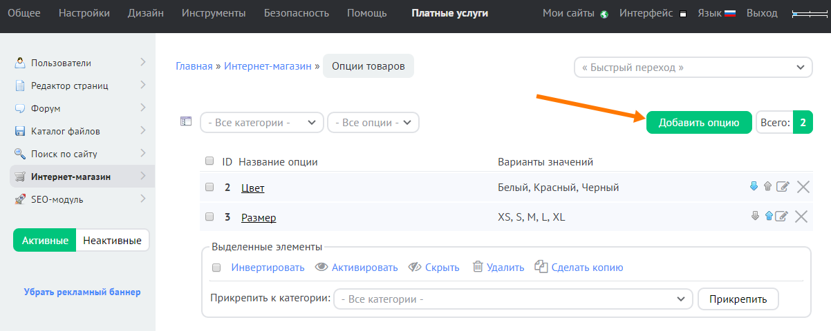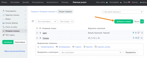 Чтобы добавить новую опцию, перейдите в панель управления: “Интернет-магазин” / “Опции товаров”: