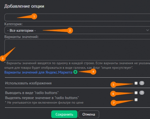 - Варианты значений для Яндекс.Маркета. Значения опций, которые будут выгружены в YML-файл для Яндекс.Маркета. Количество вариантов значений должно соответствовать количеству значений, указанных в поле "Варианты значений". Лишние значения не будут учтены. Для недостающих значений будут использоваться значения из поля "Варианты значений".