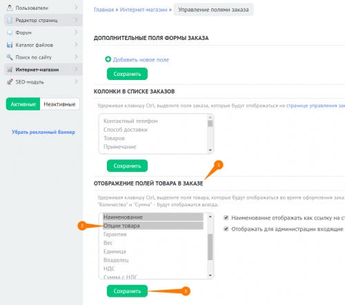 Чтобы выбранная опция отображалась в корзине и таблице с заказом, зайдите в раздел Управление полями заказа / Отображение полей товара в заказе и включите в нем отображение колонки “Опции”: