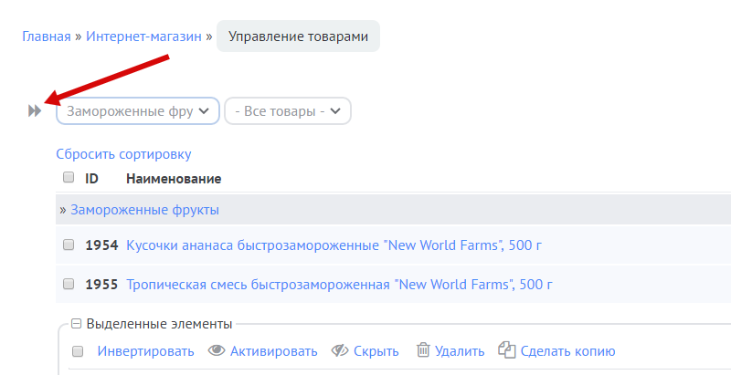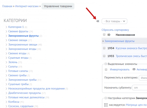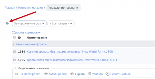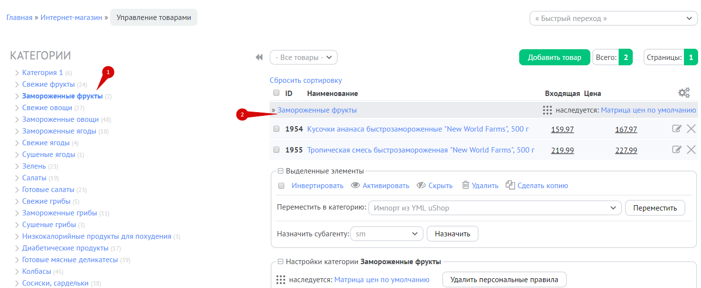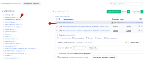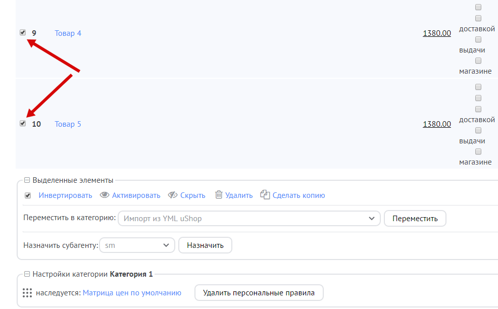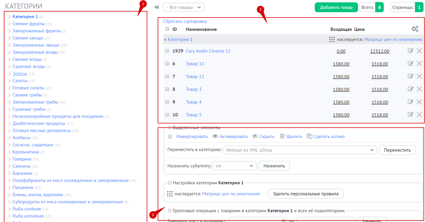 Панель “Действия” позволяет проводить групповые операции с отмеченными товарами или целыми категориями товаров.