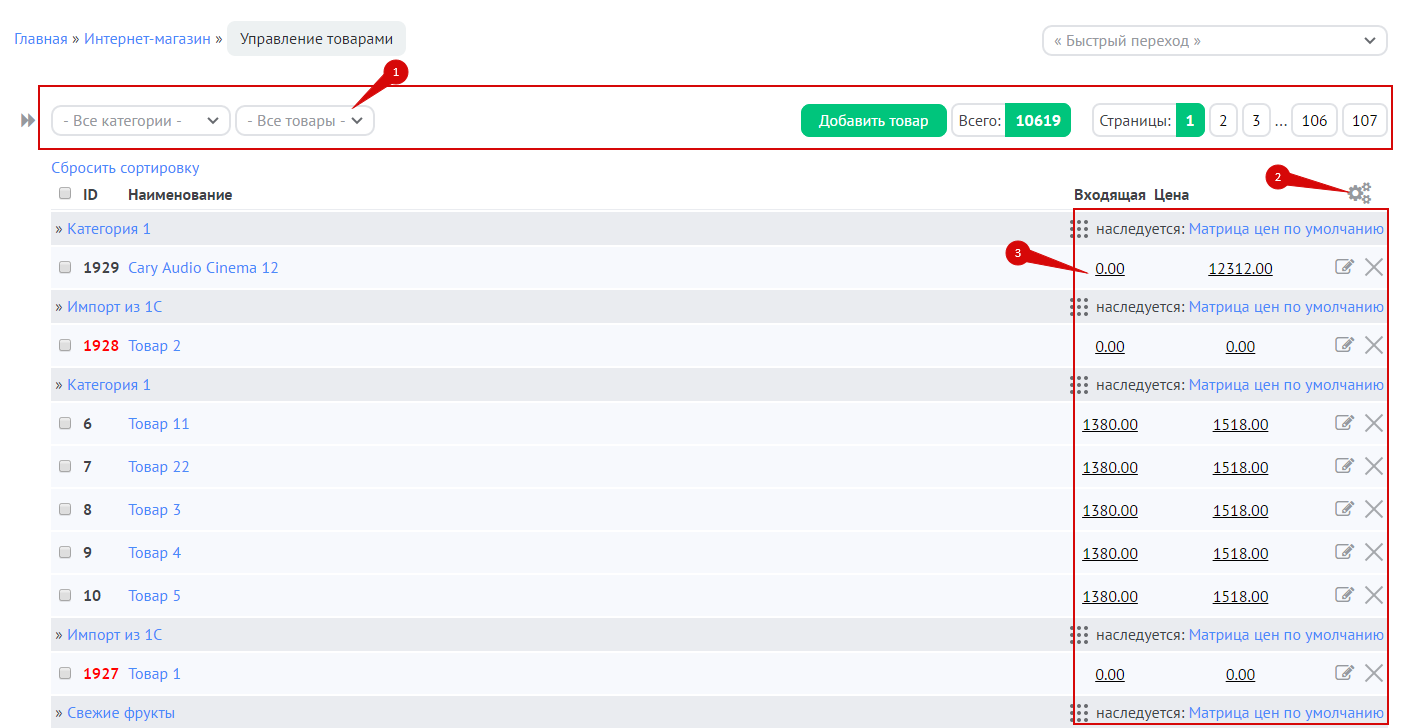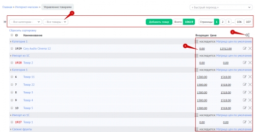 Блок “Товары” позволяет быстро найти и изменить параметры товаров: