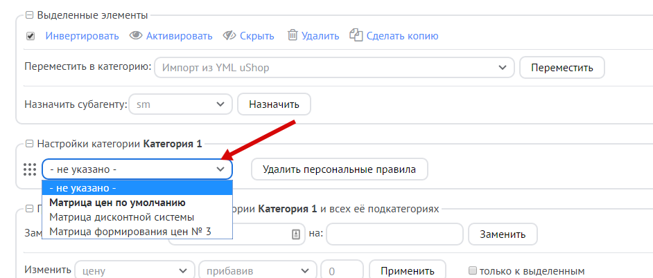 Чтобы изменить правило расчета цен для всех товаров выбранной категории, укажите новую матрицу формирования цен: