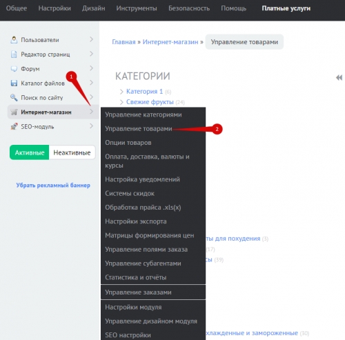 Чтобы попасть в панель управления товарами, в панели управления сайтом выберите модуль “Интернет-магазин” и перейдите в раздел “Управление товарами”: