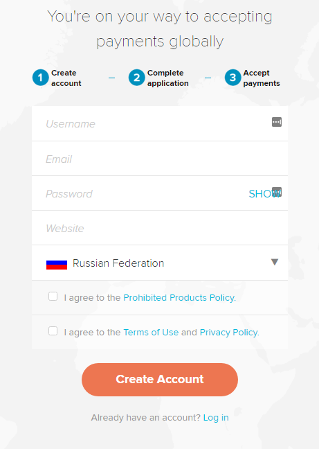Перейдите по ссылке https://www.2checkout.com/signup и укажите логин, email, пароль, сайт и страну:
