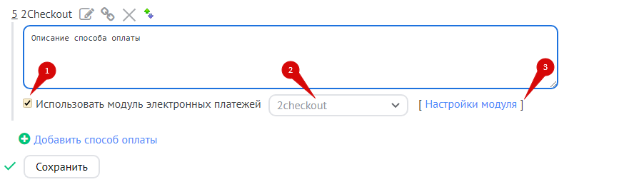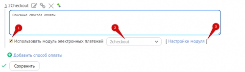 В панели управления интернет-магазином добавьте новый способ оплаты, включите опцию «Использовать модуль электронных платежей» (1), выберите в списке «2Checkout» (2) и перейдите к настройкам (3):