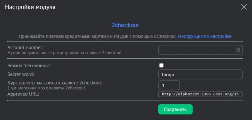 - Approved URL. Скопируйте ссылку и укажите ее в разделе Account сервиса 2Checkout.