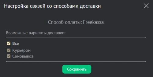 Снимите галочку «Все» в возможных вариантах доставки и оставьте только допустимые способы оплаты. Например, так: