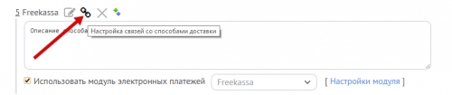 В панели управления интернет-магазином откройте список со способами оплаты и выберите тот, который хотите настроить. В названии способа найдите значок между «Переименовать» и «Удалить». При наведении на него курсора можно увидеть подсказку «Настройка связей со способами доставки»: