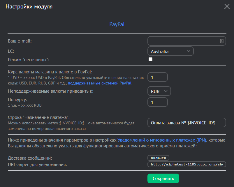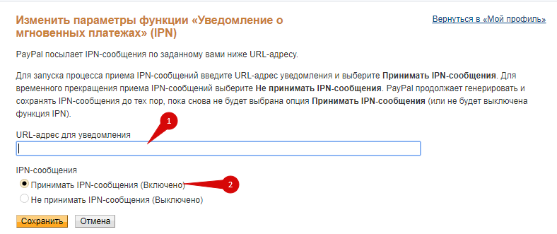 Следующие два поля необходимо продублировать в настройках аккаунта PayPal: