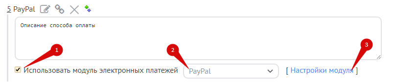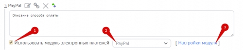 В панели управления интернет-магазином добавьте новый способ оплаты, включите опцию «Использовать модуль электронных платежей» (1), выберите в списке «PayPal» (2) и перейдите к настройкам (3):