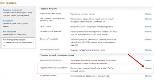 Откройте раздел «Профиль» и выберите в меню «Мои инструменты продаж» или перейдите по ссылке. Откроется страница, на которой нужно найти раздел «Уведомления о мгновенных платежах» и нажать на кнопку «Обновить» напротив него: