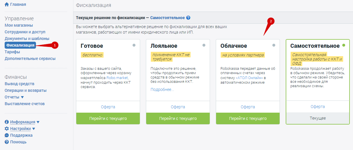 В личном кабинете ROBOKASSA откройте раздел «Фискализация» и выберите схему работы: