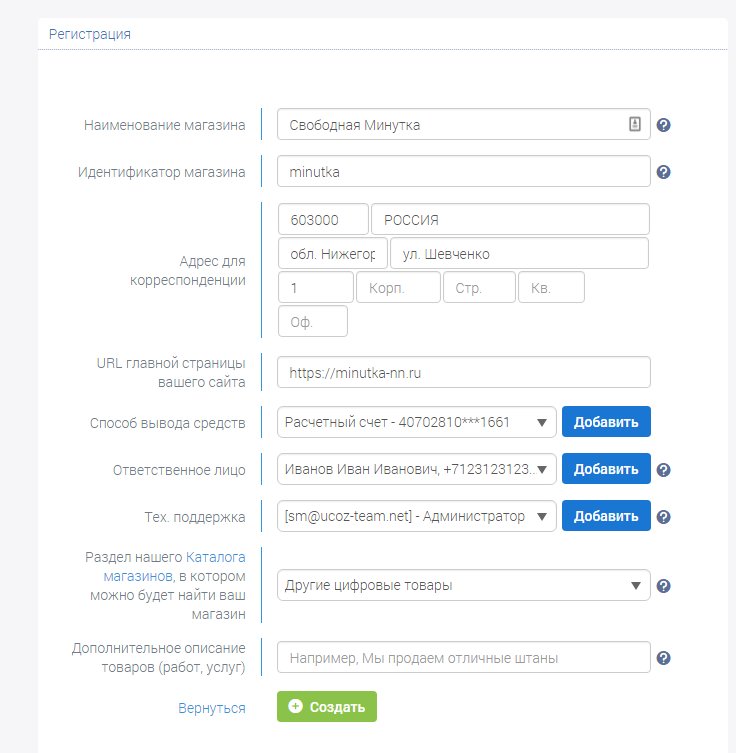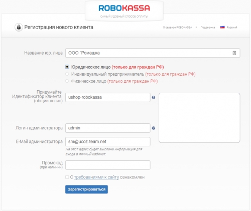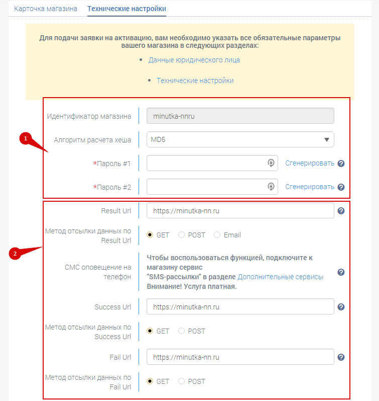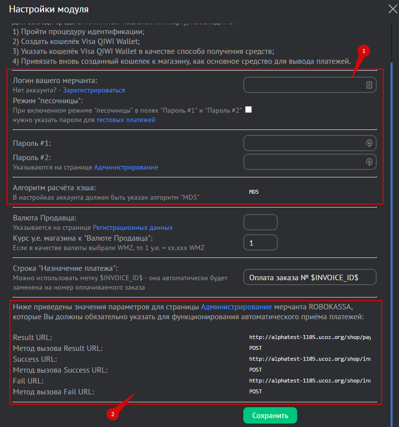 Все данные из Блока 1 необходимо скопировать в соответствующие поля настроек способа оплаты магазина uShop.