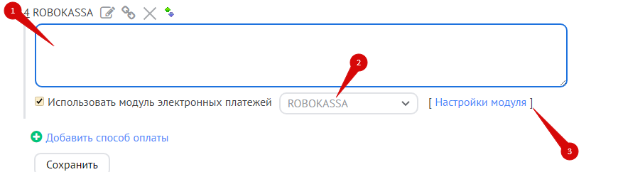 Укажите название и описание способа оплаты (1), установите галочку «Использовать модуль электронных платежей» и выберите в списке «ROBOKASSA» (2). Нажмите на ссылку «Настройки модуля» (3):