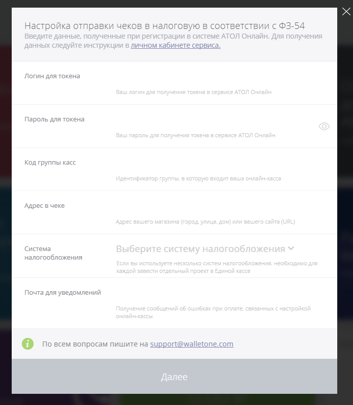 Почту для отправки сообщений об ошибках, возникающих при генерации чека онлайн-кассой.