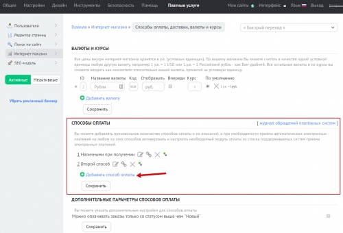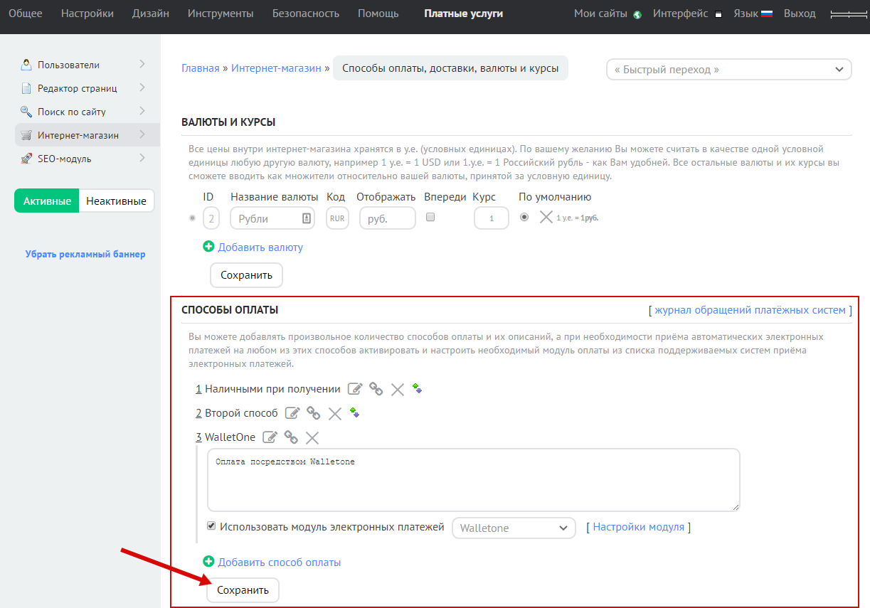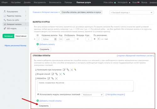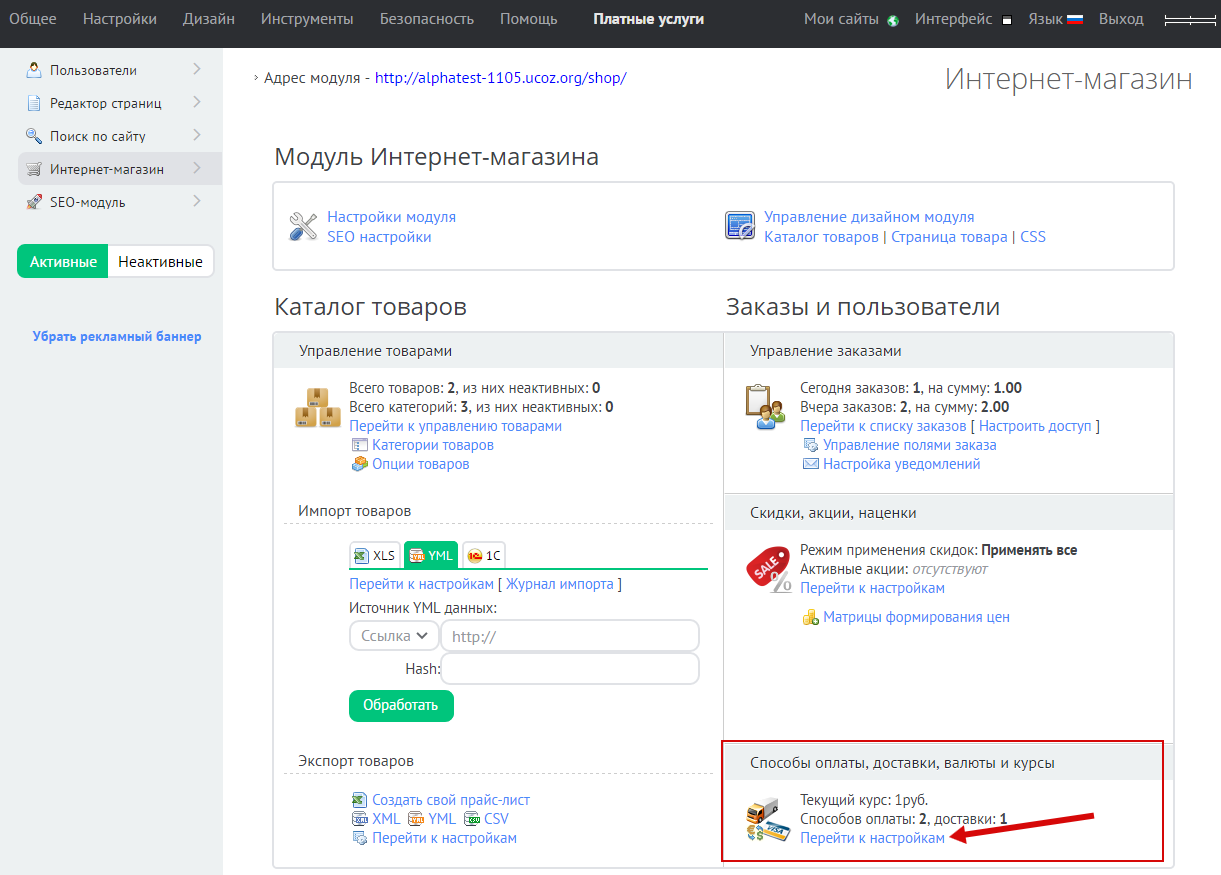 Войдите в панель управления и перейдите в раздел «Интернет-магазин». Найдите пункт «Способы доставки, оплаты, валюты и курсы» и перейдите к его настройкам: