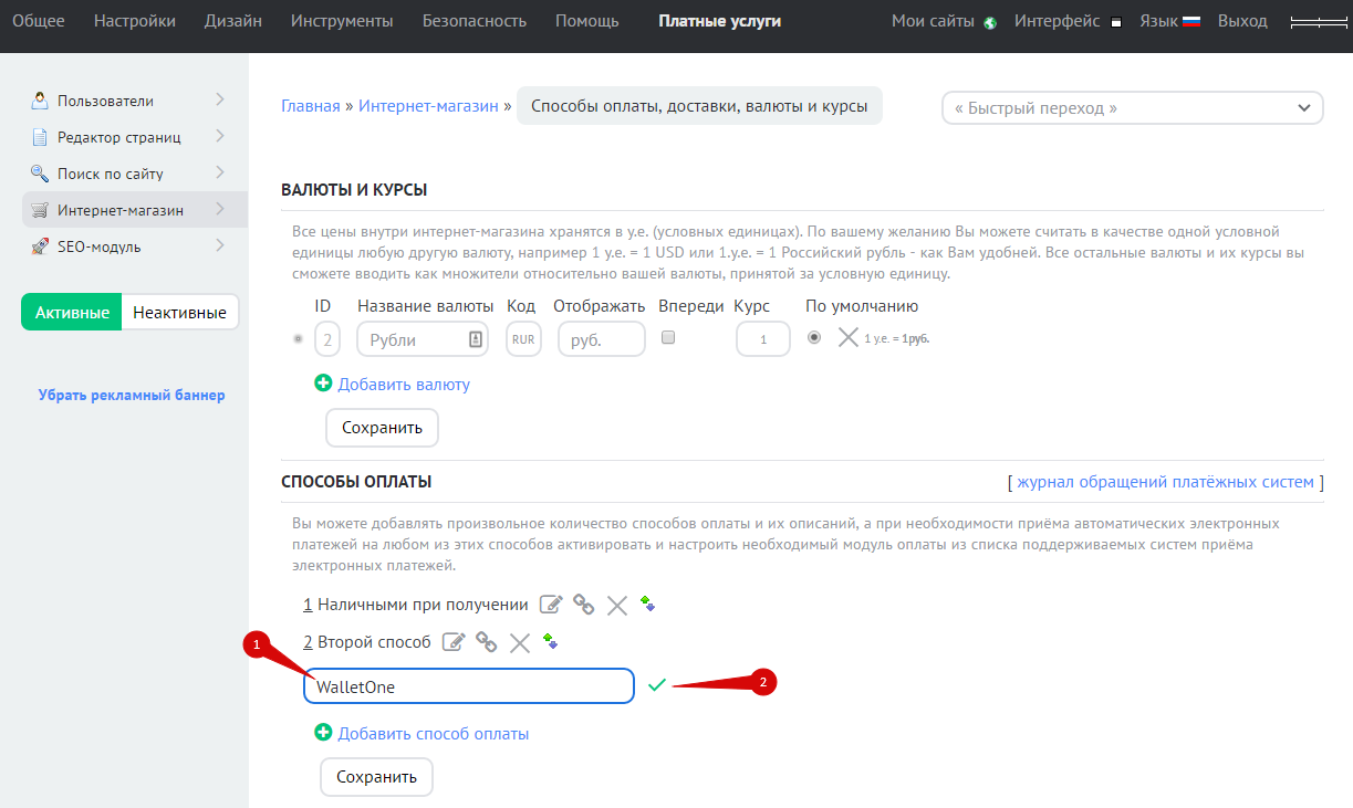 Введите название способа оплаты (1) и нажмите на зеленую галочку (2):