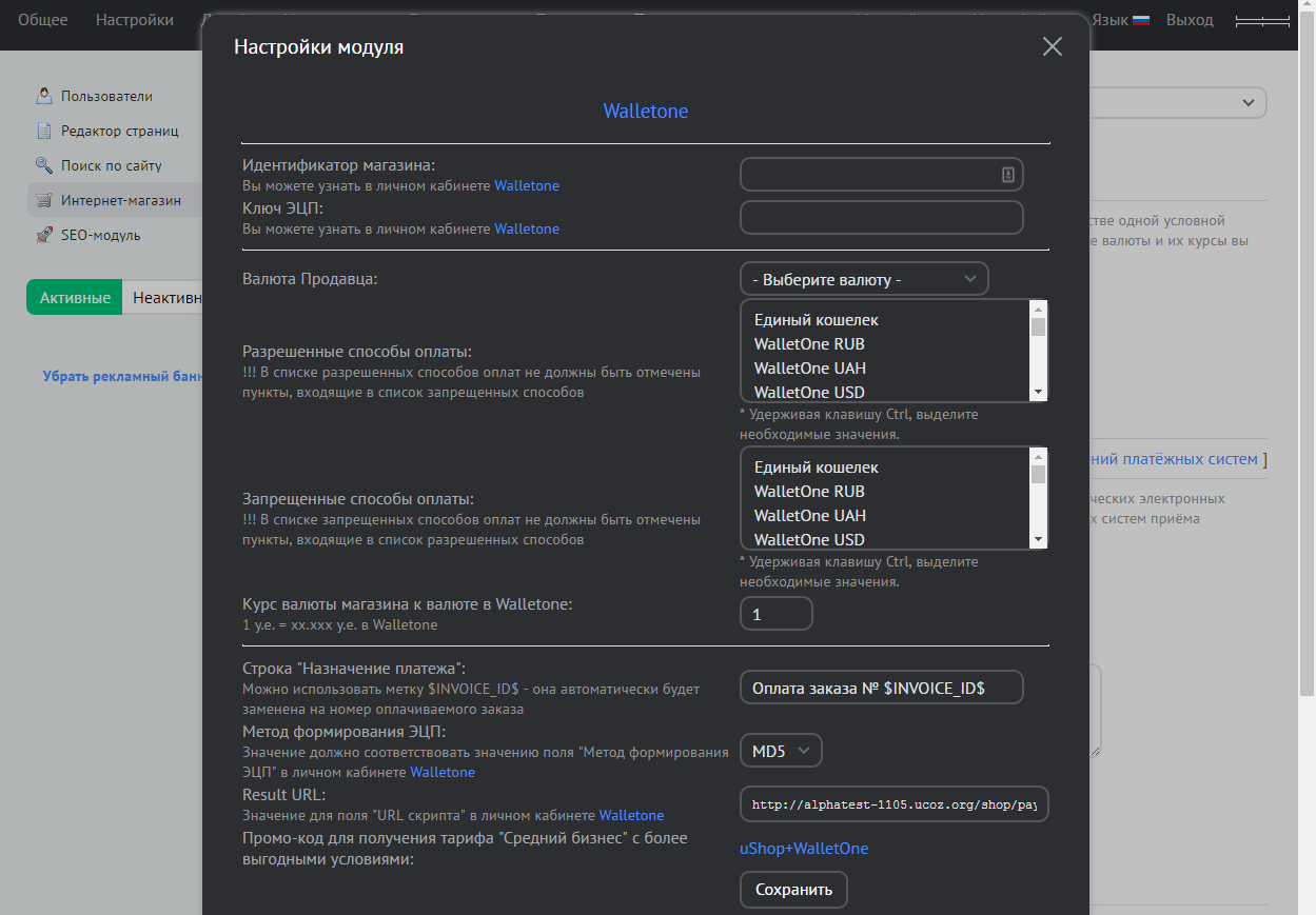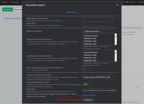 Чтобы принимать платежи через Wallet One, вам необходимо зарегистрироваться на сайте (http://www.walletone.com/merchant/?promo=uShop+WalletOne):