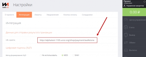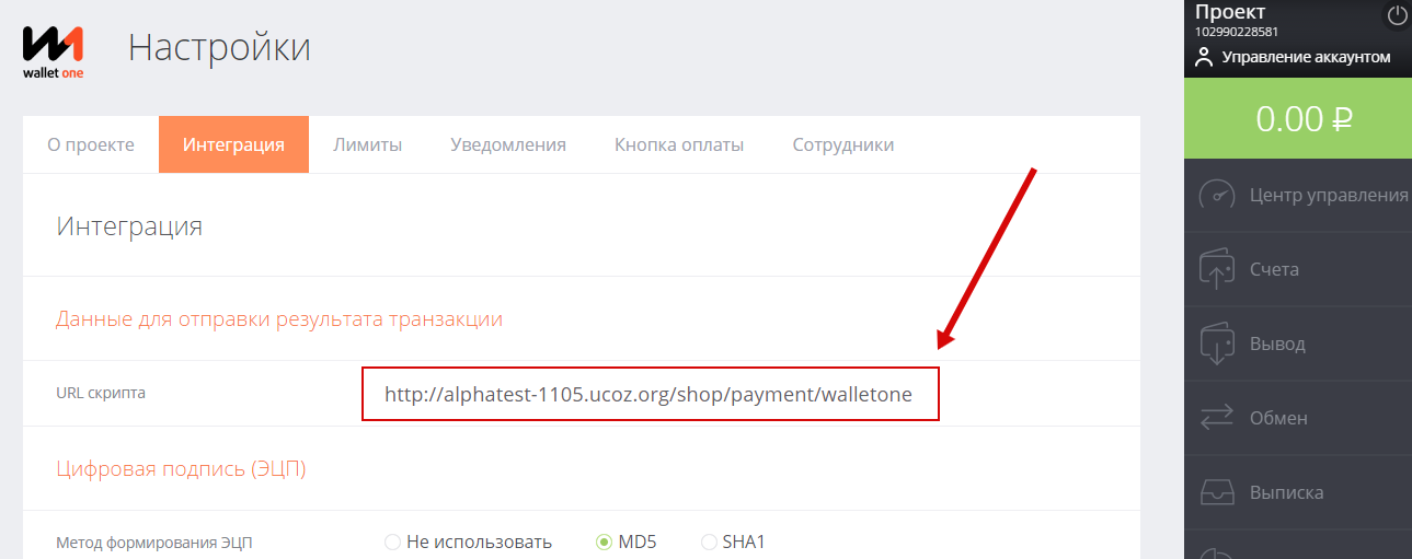 После формирования ключа и закрытия вкладки с настройками его нельзя будет посмотреть повторно. Поэтому, не закрывая вкладки личного кабинета WalletOne, перейдите в панель управления своим магазином.
