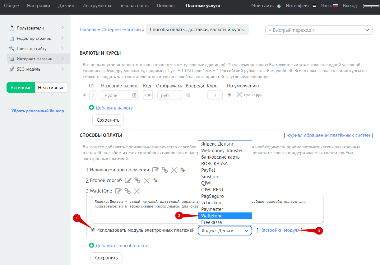 В появившемся блоке установите «Использовать модуль электронных платежей» (1), выберите «WalletOne» (2) и нажмите на кнопку «Настройки модуля» (3):