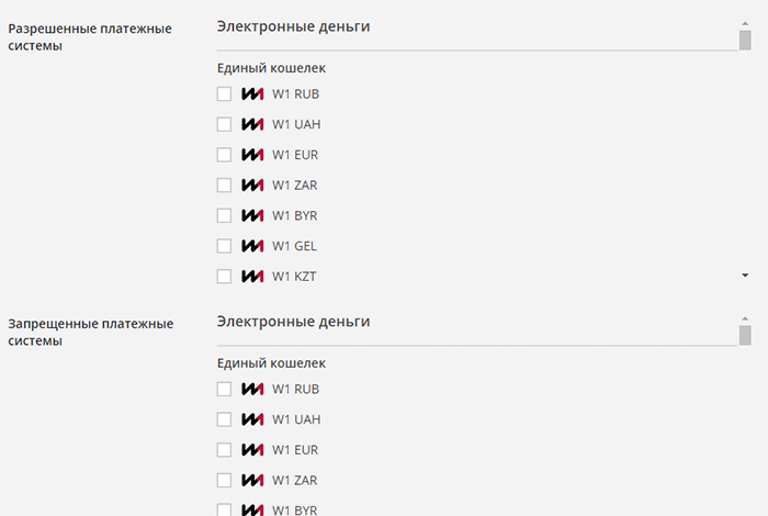- Разрешенные и запрещенные способы оплаты. После передачи платежной формы в «Единую кассу» покупатель выбирает удобный для него способ оплаты. «Интернет-магазин» может ограничить список доступных способов оплаты или явно определить один из них. Если не выбран ни один вариант для разрешенной системы, значит выбраны все. Не забудьте, что список актуальных систем может отличаться от приведенного в модуле. Это также зависит от включенного набора в вашей кассе.