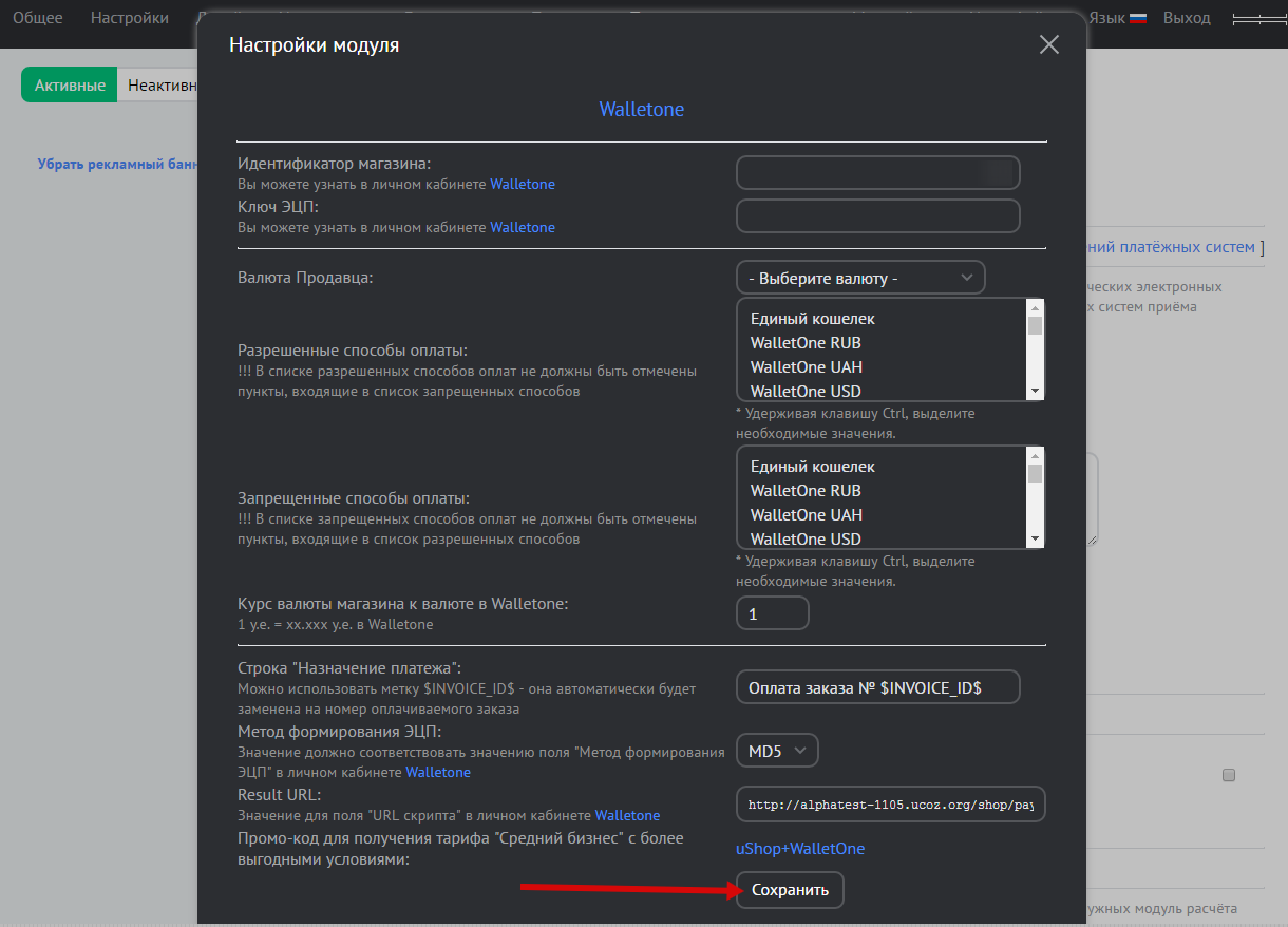 Укажите промокод “uShop+WalletOne“, если он не определится автоматически. Это даст возможность использовать тариф «Средний бизнес» с более выгодными условиями. Если вы не указали промокод, то после регистрации использовать его будет уже нельзя.