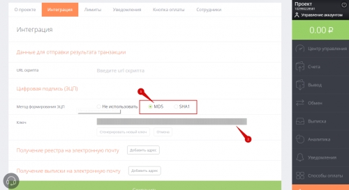 Выберите метод формирования подписи (MD5 или SHA1) и скопируйте ключ. Не забудьте нажать на кнопку «Сохранить», иначе полученный секретный ключ не будет действителен: