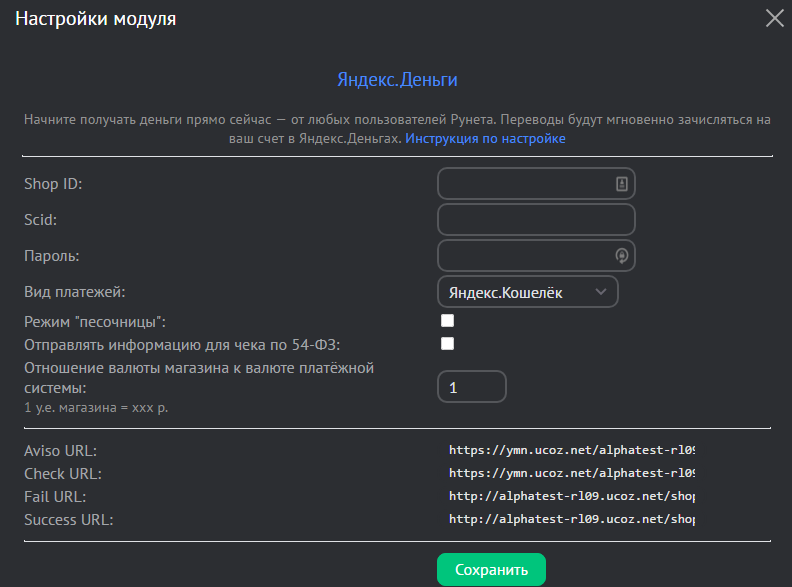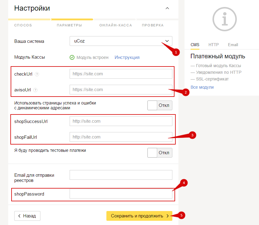 - Пароль, AvisoURL, CheckURL, Fail URL, Success URL — должны совпадать в настройках способа оплаты магазина и настройках подключения Яндекс.Кассы.