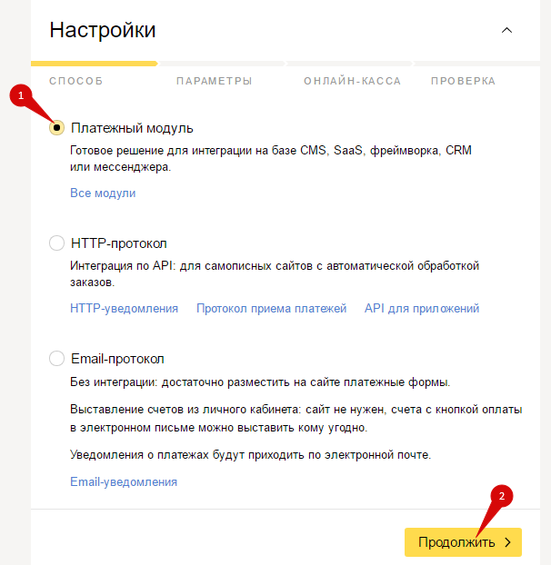 Перейдите в личный кабинет Яндекс.Кассы. В настройках подключения выберите «Платежный модуль» и нажмите на кнопку «Продолжить»: