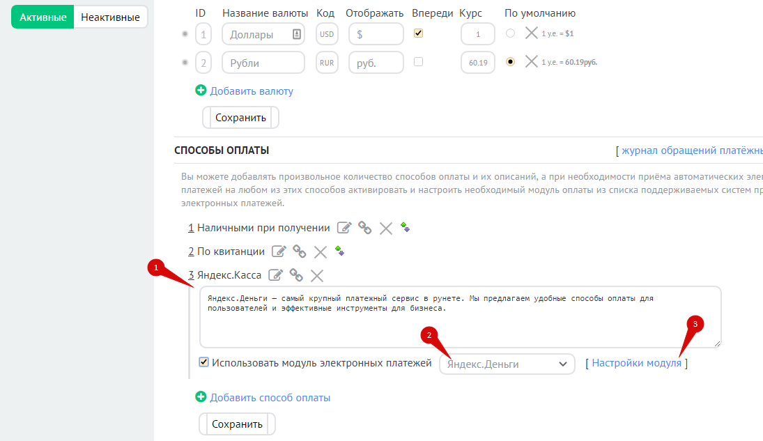 Укажите название и описание способа оплаты (1), установите галочку «Использовать модуль электронных платежей» и выберите в списке «Яндекс.Деньги» (2). Нажмите на ссылку «Настройки модуля» (3):