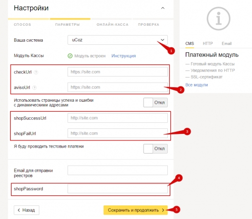 Выберите платежный модуль «uWeb» (1). Данные в пунктах 2, 3, 4 возьмите из настроек способа оплаты интернет-магазина. Нажмите на кнопку «Сохранить и продолжить»: