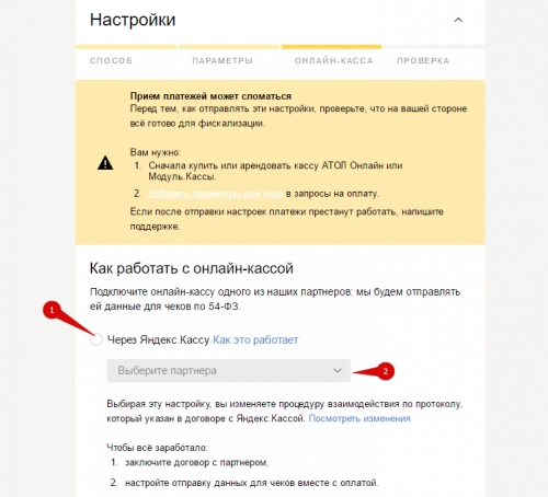 Зайдите в личный кабинет Яндекс.Кассы и найдите в нем настройки подключения, вкладка «Онлайн касса». Укажите, что собираетесь печатать чеки через Яндекс.Кассу (1) и выберите партнера (2):