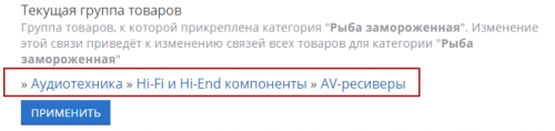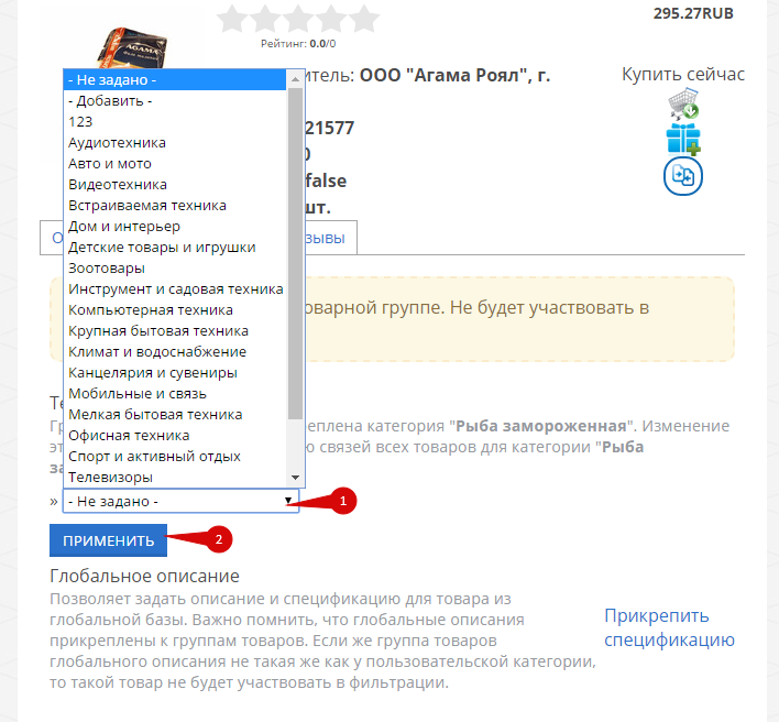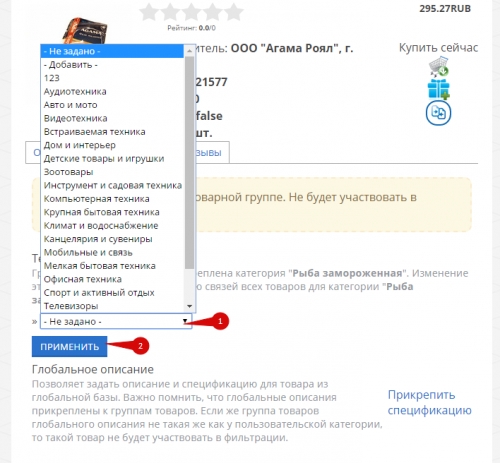 С помощью выпадающего списка (1) выберите группу товаров и нажмите на кнопку “Применить” (2):