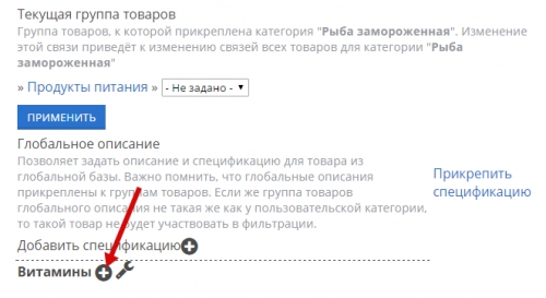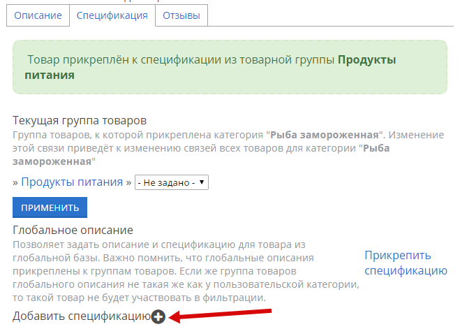 Вы только что создали новую группу и прикрепили к ней товар. Теперь нужно добавить спецификацию для этой группы. Нажмите на соответствующую кнопку: