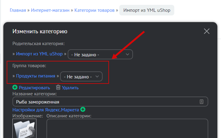 Если переменная есть, но фильтры все равно не появляются, убедитесь, что они настроены для категории товаров, в которой вы ожидаете их увидеть. Зайдите в панель управления “Интернет-магазин” / “Управление категориями” и нажмите на значок редактирования категории. В открывшемся окне найдите пункт “Группа товаров”: