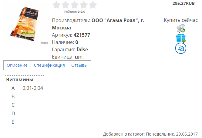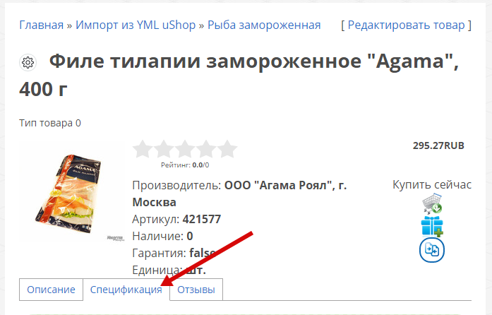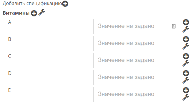После этого вы увидите на странице товара блок, отвечающий за показ и редактирование спецификаций товара: