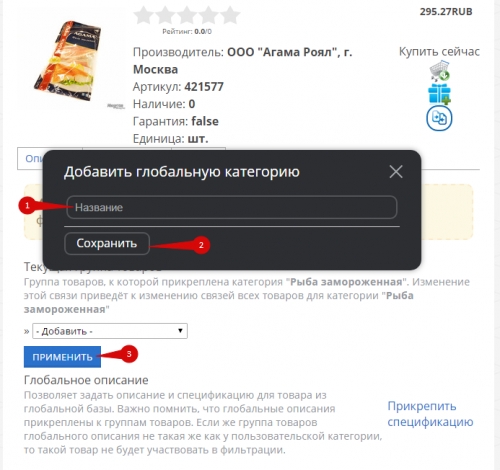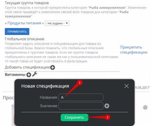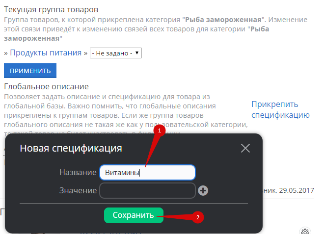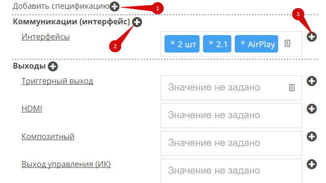 Если подходящих спецификаций (1), свойств (2) или значений (3) в группе не нашлось, добавьте новые: