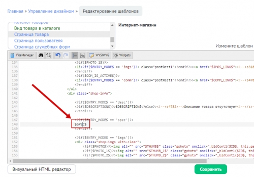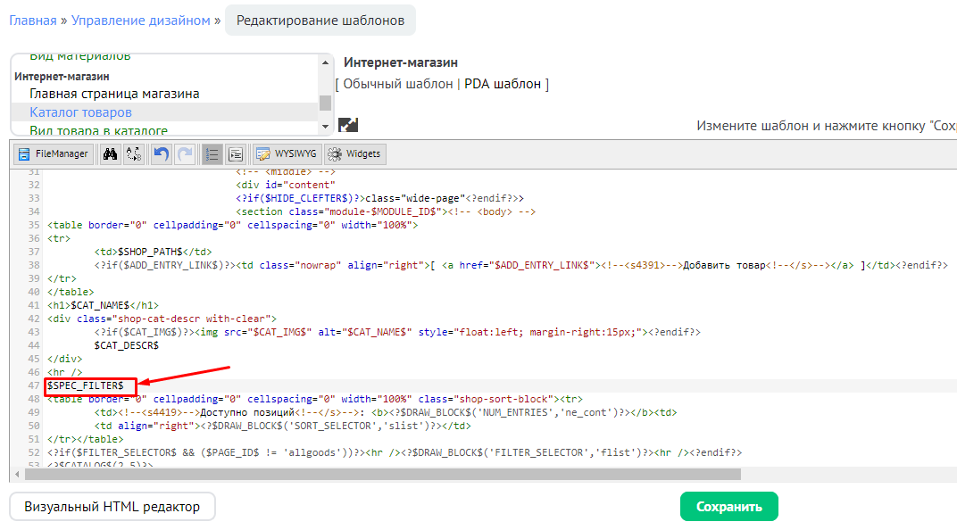 Чтобы посетители магазина могли фильтровать товары, убедитесь, что вы разместили в шаблоне “Каталог товаров” переменную $SPEC_FILTER$. Она может располагаться в шаблоне глобального блока “Первый контейнер” или “Второй контейнер”: