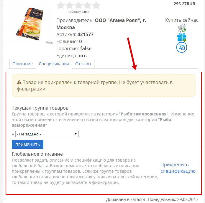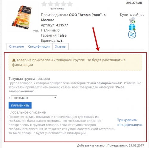 Если вы прикрепили товар к группе, в которой имеются спецификации, то все они появятся сразу после прикрепления: